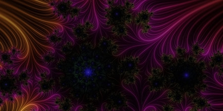 An intricate fractal pattern featuring swirling explosions and twirls of blue, orange, and purple against a dark background.