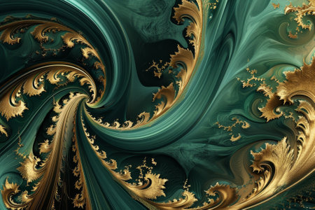 A luxury wallpaper pattern with a swirling design of emerald and gold