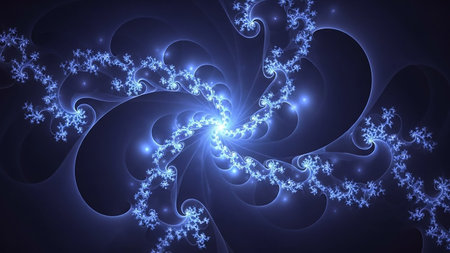 A luminous blue fractal pattern forms an intricate spiral with delicate branching structures, radiating light against a deep dark background.