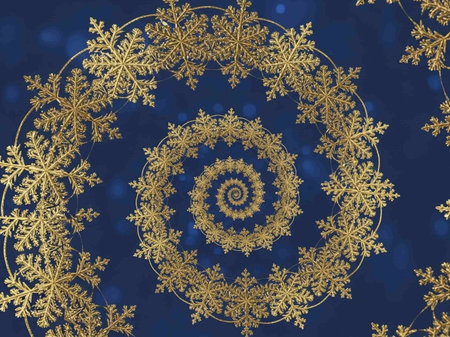 A detailed fractal spiral pattern in shades of blue, purple, and gold against a dark, star-filled background, creating a sense of cosmic depth and intricate design. Clear details and vibrant col...
