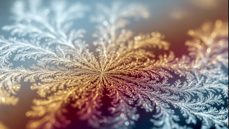 Intricate frost pattern forming a delicate, symmetrical design on a dark background, illuminated with warm, golden light