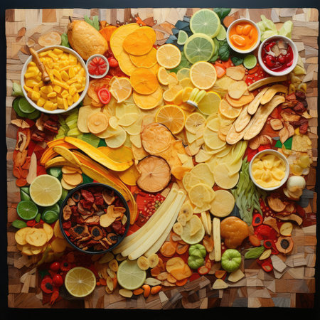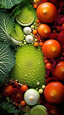 Immerse yourself in a vibrant kaleidoscopic image that showcases the diverse array of fruits and vegetables found in a bountiful harvest. This visually stunning composition captures the essence of nature's medley of flavors, with its lively color palette, intricate patterns, and whimsical elements. Feast your eyes on the vibrant hues and intricate details of this artwork, and let your imagination wander through the abundance of nature's bounty.