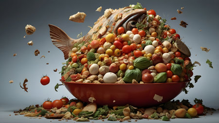 Visually appealing still life composed of various food items, including fish and pasta, arranged artistically on a pale yellow background. The diverse textures and colors create a rich visual tapestry.