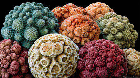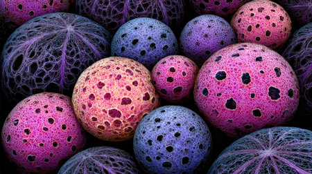 High-resolution close-up view of several spherical objects, each exhibiting a complex, repetitive, and detailed surface texture. The objects are in various shades of color, creating a visually appealing cluster of intricate patterns. The image highlights the fascinating details of these structures at a magnified scale.