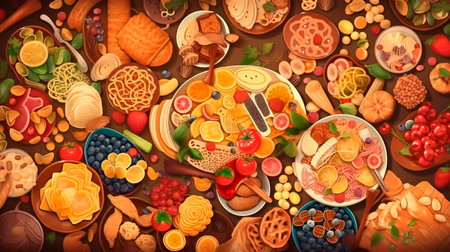 Top view of various foods as culinary concept background illustration. Generative AI illustrator