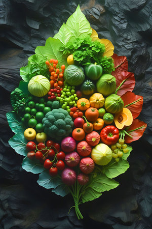 A vibrant display featuring an artistic arrangement of fresh vegetables and fruits, creating a symmetrical design on a marble surface. Perfect for promoting healthy eating and culinary art.