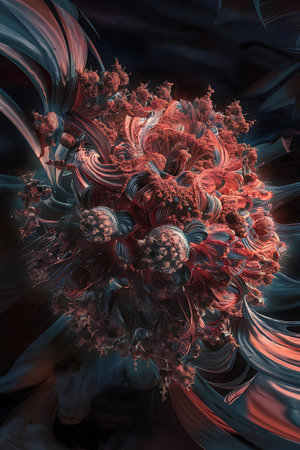 Computergenerated image of a colorful swirl in space, resembling an organism. It features electric blue tones and intricate patterns, evoking science and macro photography