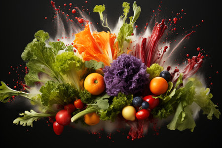 Fresh vegetables and fruits with water droplets exploding on black background, healthy eating concept, AI Generated illustration