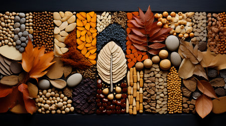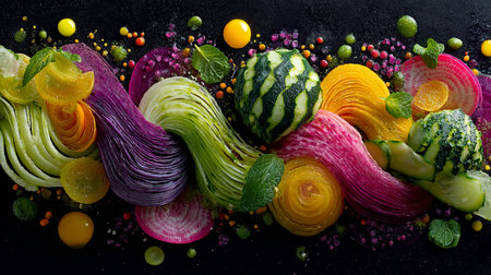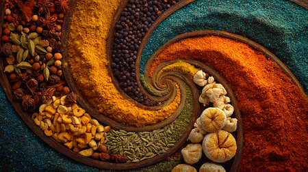 vegetables, spices, and other ingredients arranged in a beautiful and artistic way, created with generative ai