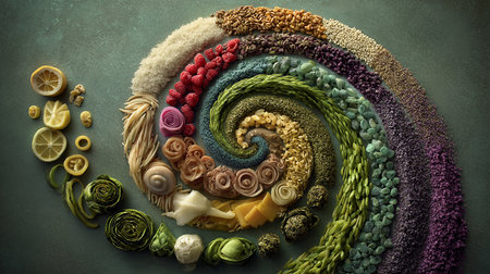 An artistic display of diverse food ingredients layered in vibrant colors showcases the beauty of culinary diversity and healthy eating habits.