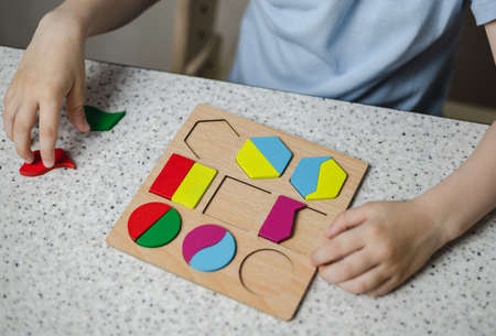 Close-up of hands of unrecognizable child inserting wooden blocks into the grooves of the educational toy. concept of children education.