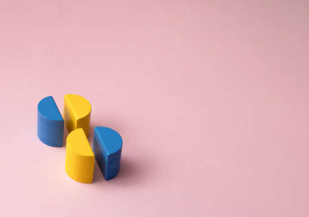 Abstract geometric composition, made with blue and yellow wooden shapes on pastel pink background. Modern minimal concept.