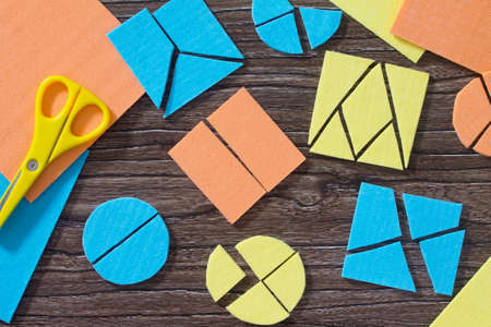 Puzzle study of mathematical fractions and square Gather on the wooden table. The concept of early childhood development.