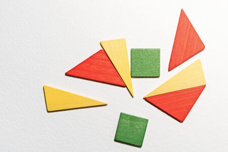 Different colorful shapes wooden on white background. Geometric shapes red, green, yellow colors, top view. Concept of geometry. Copy space. Children educational logical task. Flat lay.
