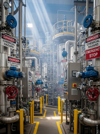 Interior view of a complex industrial chemical plant featuring stainless steel pipes, valves, gauges, control panels, and safety warning signs with sunlight streaming through.