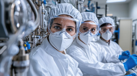 Three people in white lab coats and masks are standing in front of a machine. Scene is serious and focused, as the people are likely working in a laboratory or medical setting
