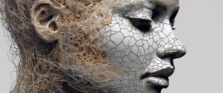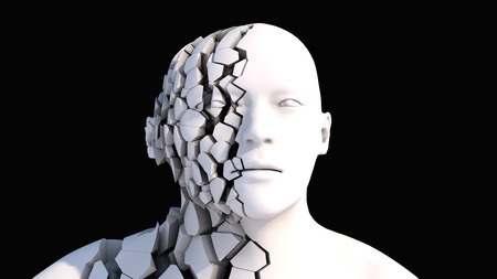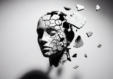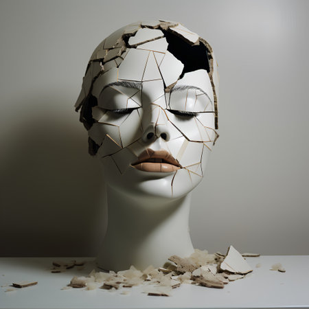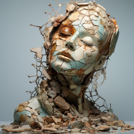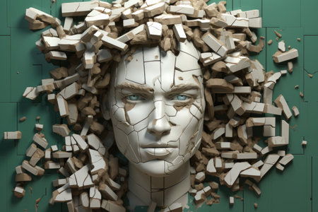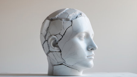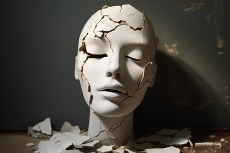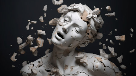 Abstract monochrome visual of a human head sculpture cracking and falling apart into pieces. Symbolizes mental health issues, stress, breakdown, anxiety, fragility, and psychological pressure. Modern conceptual art.