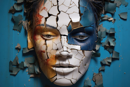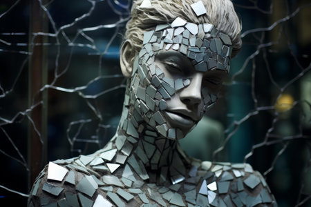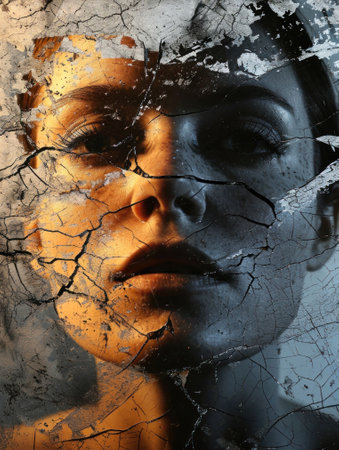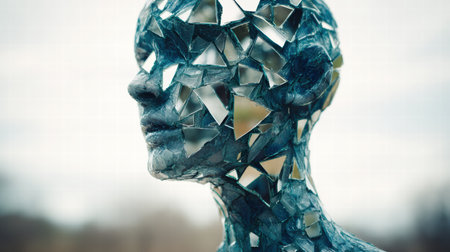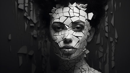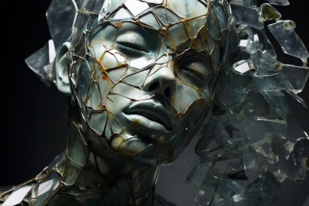 Shattered glass reflects a fragmented and expressive face highlighting emotions and intricate details of a gaze. Generative AI