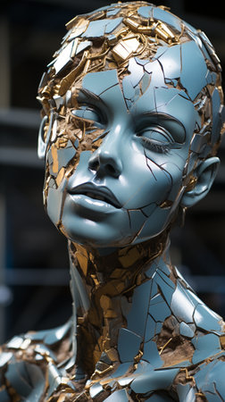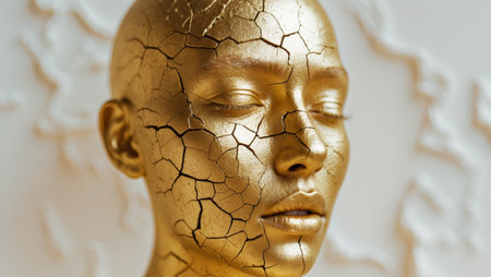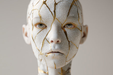 Cracked ceramic face resembling a human, featuring golden kintsugi-style repairs. The delicate, intricate lines and serene expression evoke a sense of fragile beauty and resilience