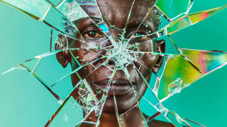 Striking Portrait of African Woman Through Shattered Glass on Teal Background