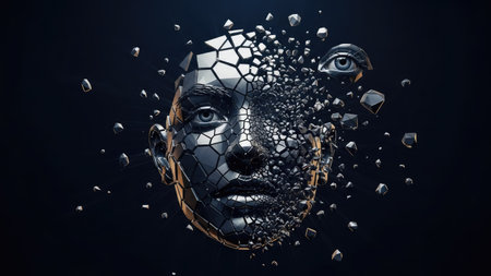 Cyborg woman face disintegrating into pieces. Conceptual digital art. Generative AI
