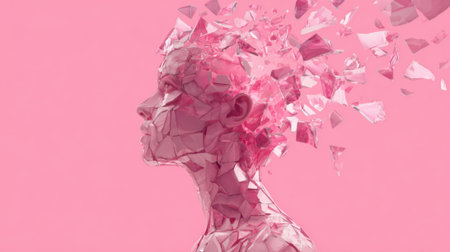 A striking representation shows a human silhouette made of shattered pieces symbolizing the complexity of emotions. The background is a vibrant pink enhancing the piece's impact.