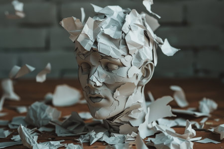 A broken statue with torn pieces of paper strewn around it. Created with Generative AI technology