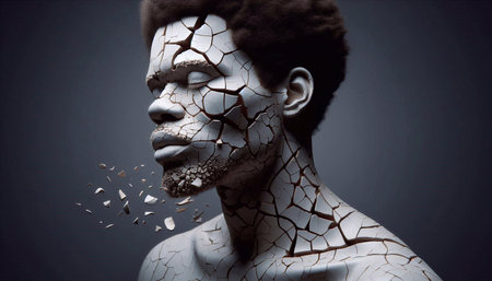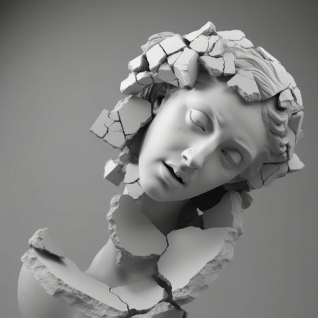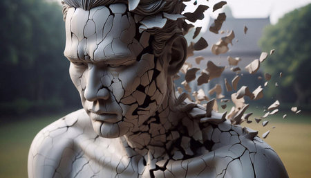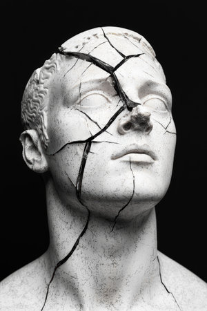 White marble statue of a male figure featuring visible cracks, symbolizing emotional distress and capturing deep feelings of sadness, despair, and the fragility of the human condition