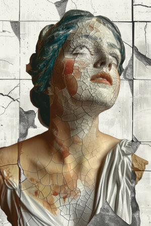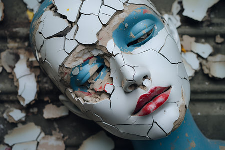 Fashion surreal Concept. Closeup portrait of cracked wax plaster cement figure statue sculpture woman peeling destroy disintegrate break into pieces. copy text space