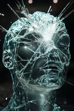 A cracked glass head with sharp shards flying outward, symbolizing mental fragmentation or sudden revelation
