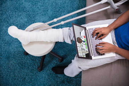 Man With Broken Leg Sitting On Sofa Using Laptop
