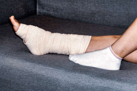 Woman with broken leg. female bandaging foot on the floor. The concept of a sore person with a limb injury. close-up.