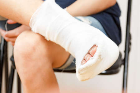 Man with broken leg from the accident in plaster cast splint is in orthopedic department at a hospital.