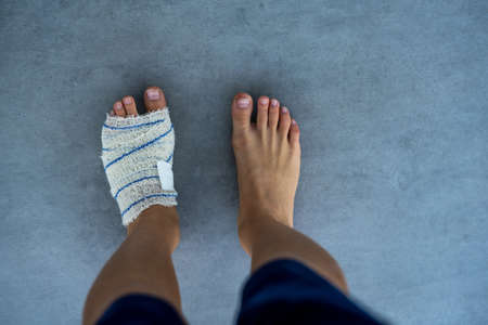 An injured foot wrapped in a bandage is gently resting on the floor, awaiting care and healing
