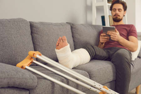 Young man sitting on sofa with broken leg in cast and crutches nearby and reading news on tablet with room interior at background, selective focus. Injury, trauma, recovery, rehabilitation concept