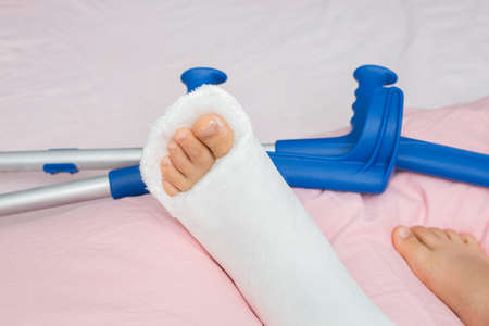 Close up bone fractures on the leg of a child. Childrens leg in a cast on the bed with crutches nearby.
