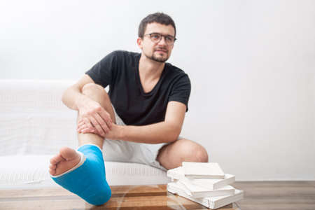 Man with broken leg in blue splint for treatment of injuries from ankle sprain reading books at the home rehabilitation.