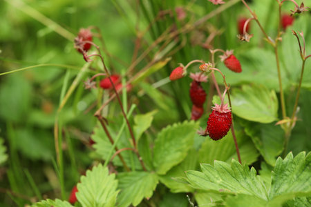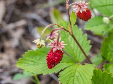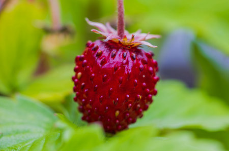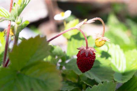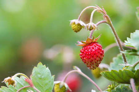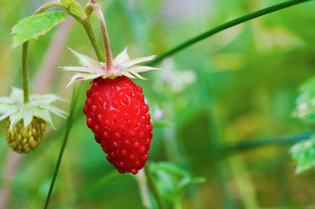 Wild strawberry is a wild berry. Close-up on blurred greenery with copying of space, using as a background of the natural landscape, ecology. Macro photography, Selective focusing.
