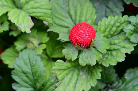 False strawberry (Potentillia hebiichigo). Rosaceae perennial grass.