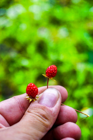Wild strawberry in hand in summer season