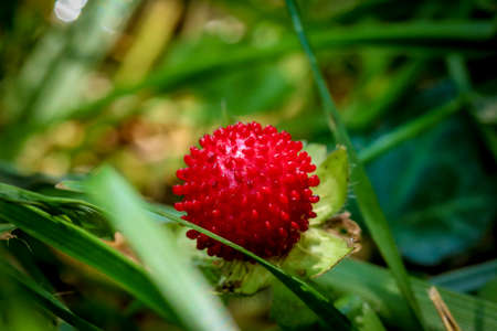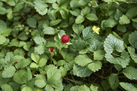 Indian strawberry (Potentilla indica) berries. Rosaceae perennial plants. They creep along the ground with stolon and produce red berries in early summer.