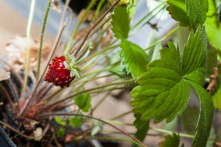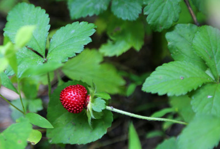 Wild strawberry plant with green leafs and ripe red fruit - Fragaria vesca.