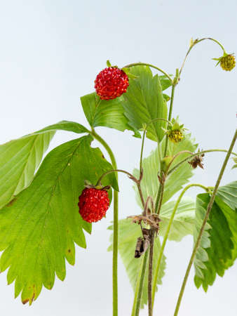 Wild strawberry (Fragaria vesca) plant with perfect ripe and unripe fruits and foliage isolated against white on sunlight. Berries and leaves on white. White taste of summer background