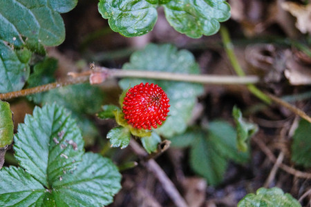 Close-up image of a wild strawberry in a garden