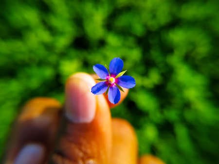 Hand in a blue medical glove holds a blue flower in the palm on a blue background.