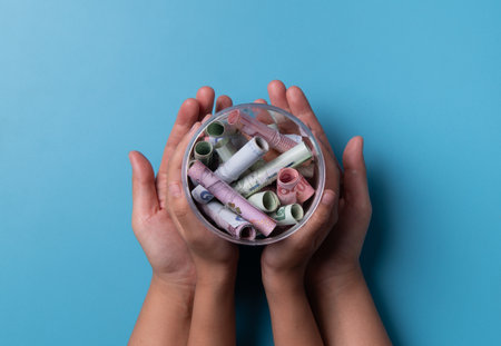 Close up of a bunch of money bills being held by female hands: Selective focus. Money concept.