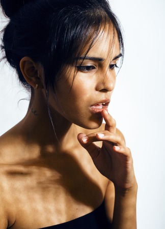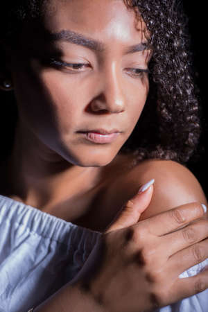 beauty latin young real woman in depression, hopelessness look, fashion makeup