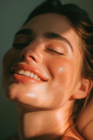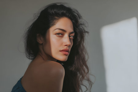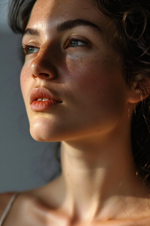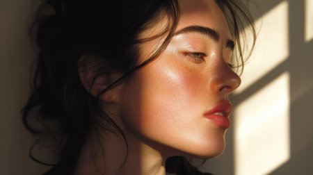 Close up portrait of young woman with natural makeup, showcasing glowing skin and soft features. light creates beautiful play of shadows on her face, enhancing her profile