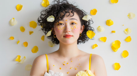 Joyful Young Woman with Yellow Petals and Sparkling Makeup on White Background
