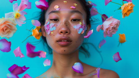 Asian woman surrounded by floating rose petals on blue background